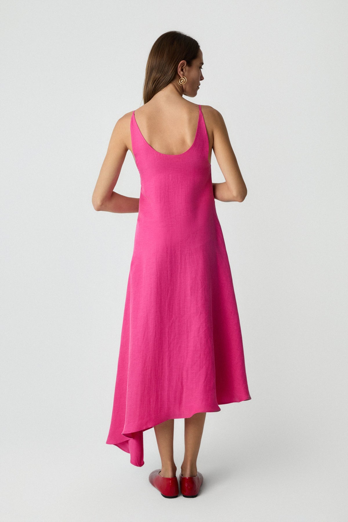 Asymmetric midi dress designed with a fluid drape and delicate straps. Crafted from lightweight fabric that moves naturally with the body for an effortless, feminine feel.